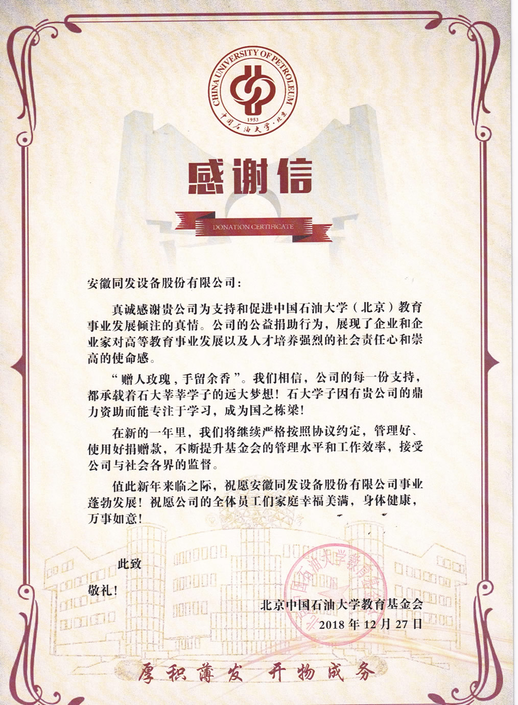 2018年度我司為支持和促進北京中國石油大學教育事業的發展公益捐贈11萬元。
