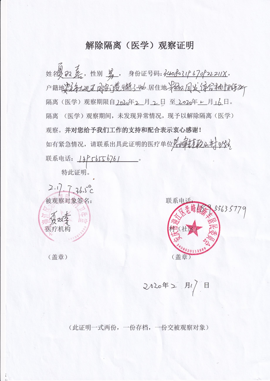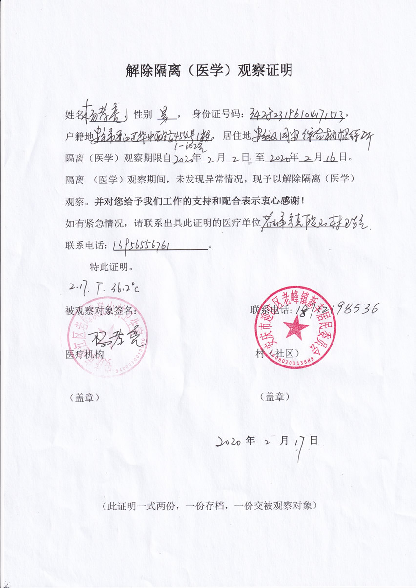 2019年2月2日我司董事長親自帶三位司機赴武漢運送支援物資,返回當天即自我隔離觀察,社區居委會和社區醫院兩家單位同時檢查各項指標均正常,解除醫學隔離觀察。