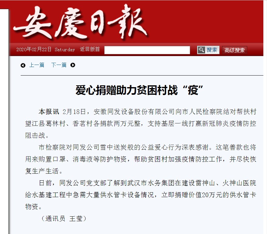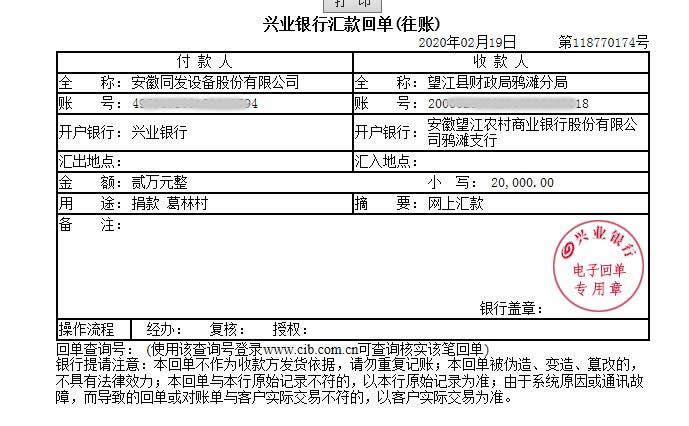 2020年2月19日,我司分別向望江縣鴉灘鎮葛林村和望江縣鴉灘鎮香茗村分別捐款兩萬元購買樹苗等。